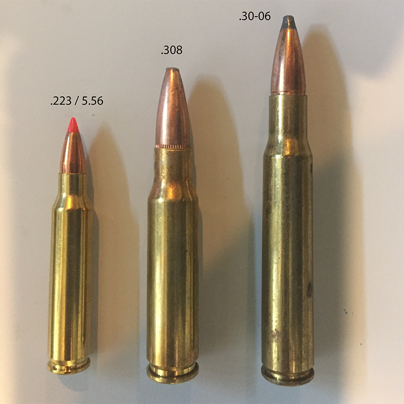 Yes, the .223 round an AR15 uses is not very powerful, in the rifle world. Here is the .223 next to a .308 and a .30-06, arguably the two most popular hunting rounds these days: